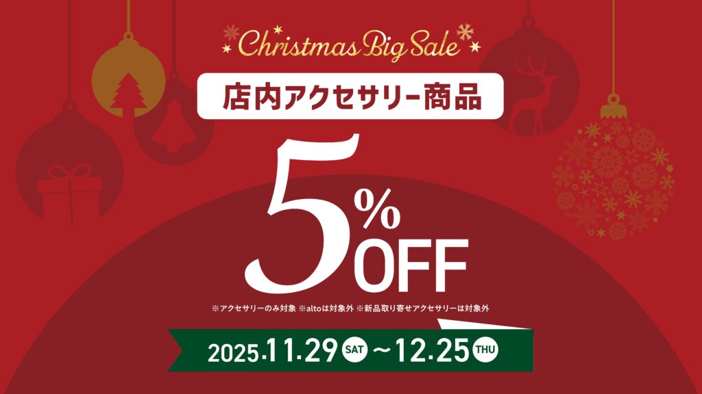 11月29日(土)〜12月25日(木)の期間中、【店内アクセサリー商品 5% OFF】キャンペーンを実施しています。