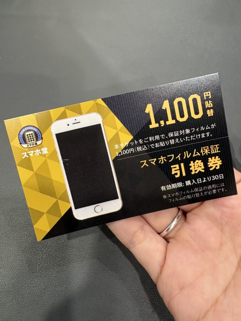 30日以内であれば上記チケットをご持参いただければ、割れたり欠けたりしてしまった場合でも1,100円で同じフィルムに貼り替えさせていただいております!