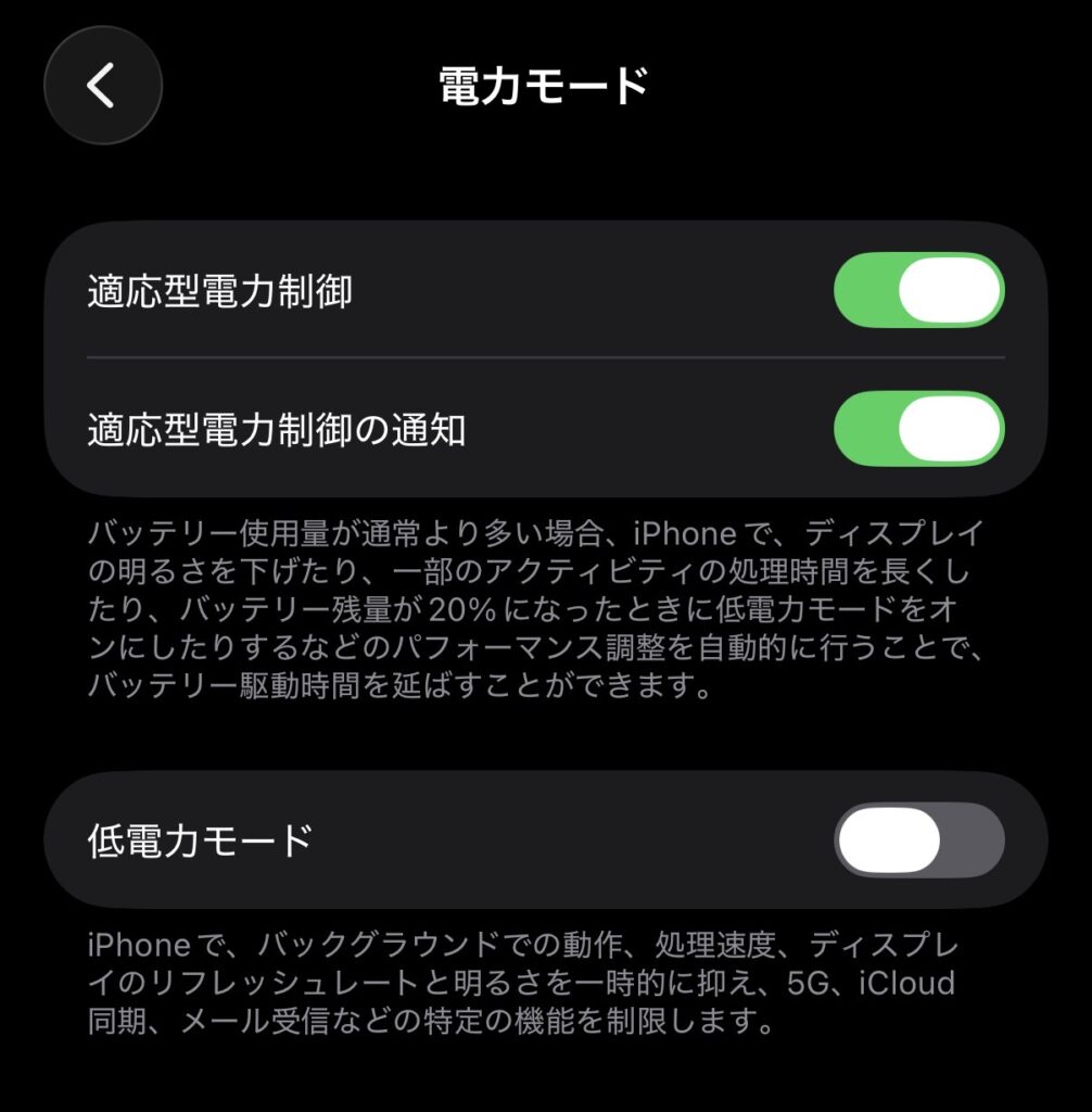 iOS26のバッテリー項目にある適応型電力制御についてお話します。