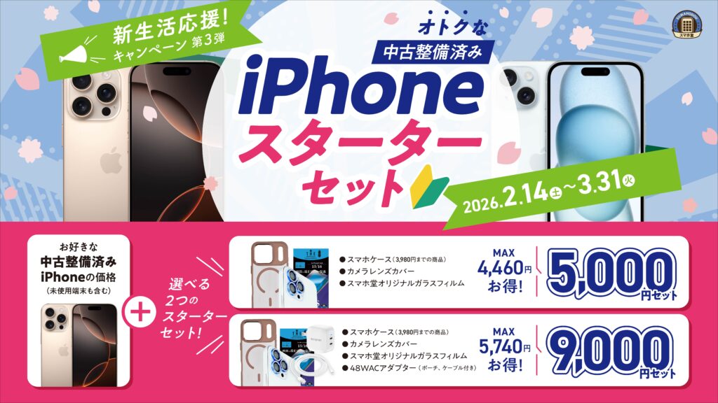 お好きな中古整備済みiPhoneの価格に選べる+5000円セットと+9000円セットが登場!iPhoneを新しくしたら必須になるアイテム(ケースやフィルムなど)がmax4460円〜5740円お得なセットです☆