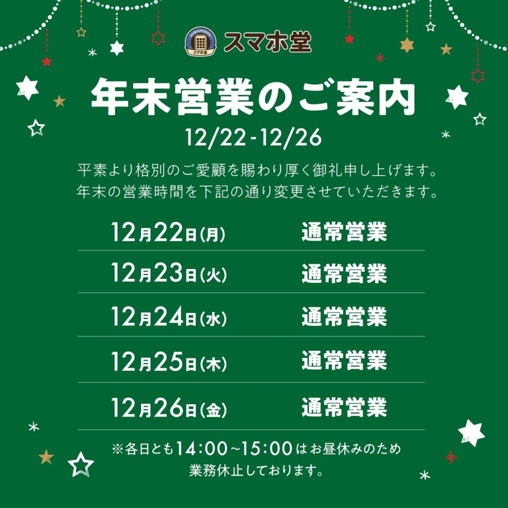 スマホ堂2025年12月度(12/22~12/26)年末営業の時間のお知らせです🎄