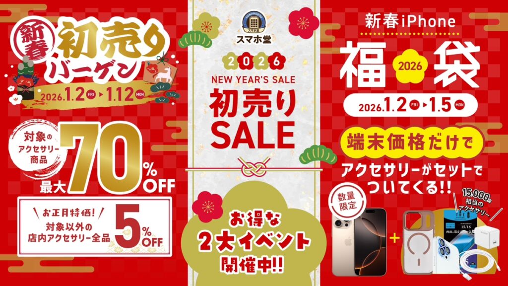 スマホ堂は年始2026年1月2日から営業します!中古整備端末のiPhoneが端末価格だけで15000円相当のアクセサリがついてくる超オトクすぎる福袋や、なんとqi充電器やケースなどのアクセサリが70%オフになる大バーゲンも期間限定でスタート⛳️対象外商品もなんと全て5%オフで大放出!