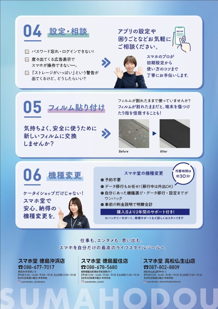 等々、お困りごとがあればスマホ堂へお越しください